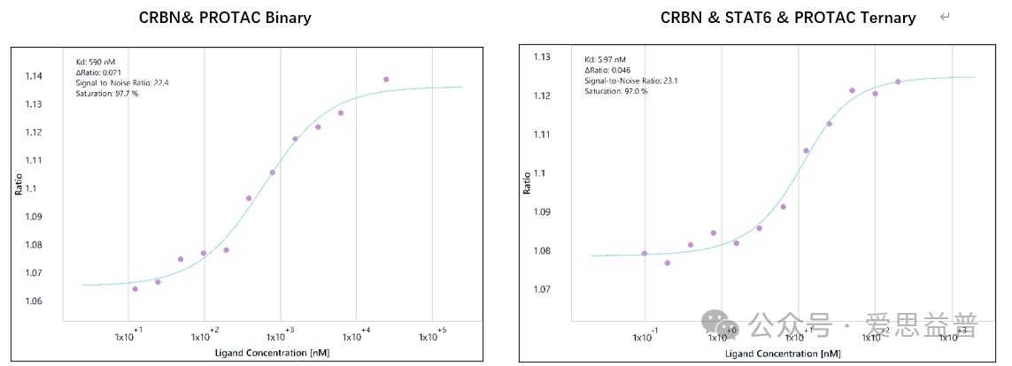 图5 采用光谱位移方法(Spectral Shift,SPS)评价PROTAC分子与CRBN(二元复合物,左图)的结合亲和力,及其与STAT6形成三元复合物(右图)的能力