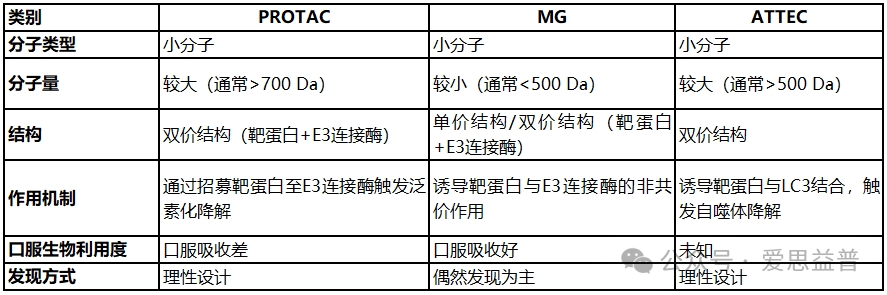 PROTAC通过双价结构同时结合靶蛋白和E3连接酶(如CRBN、VHL),利用细胞内泛素-蛋白酶体系统实现靶蛋白定向降解,但大分子量(>700 Da)和生物利用度差(口服吸收受限)成为瓶颈;而MG作为单价分子胶,通过模拟天然蛋白-蛋白互作界面,诱导靶蛋白与E3连接酶的结合,凭借小分子特性(<500 Da)和较宽浓度窗口(避免钩状效应)展现出更好的成药性。