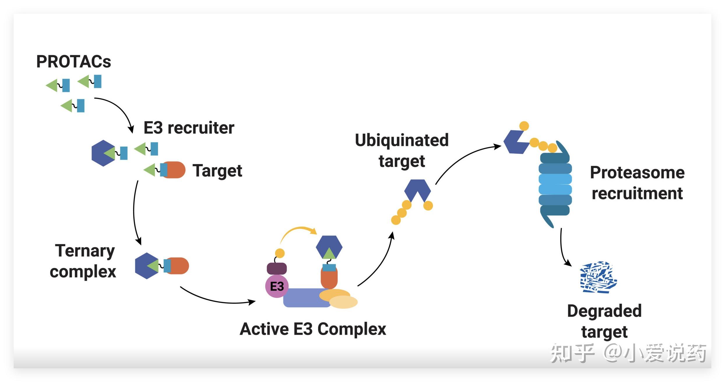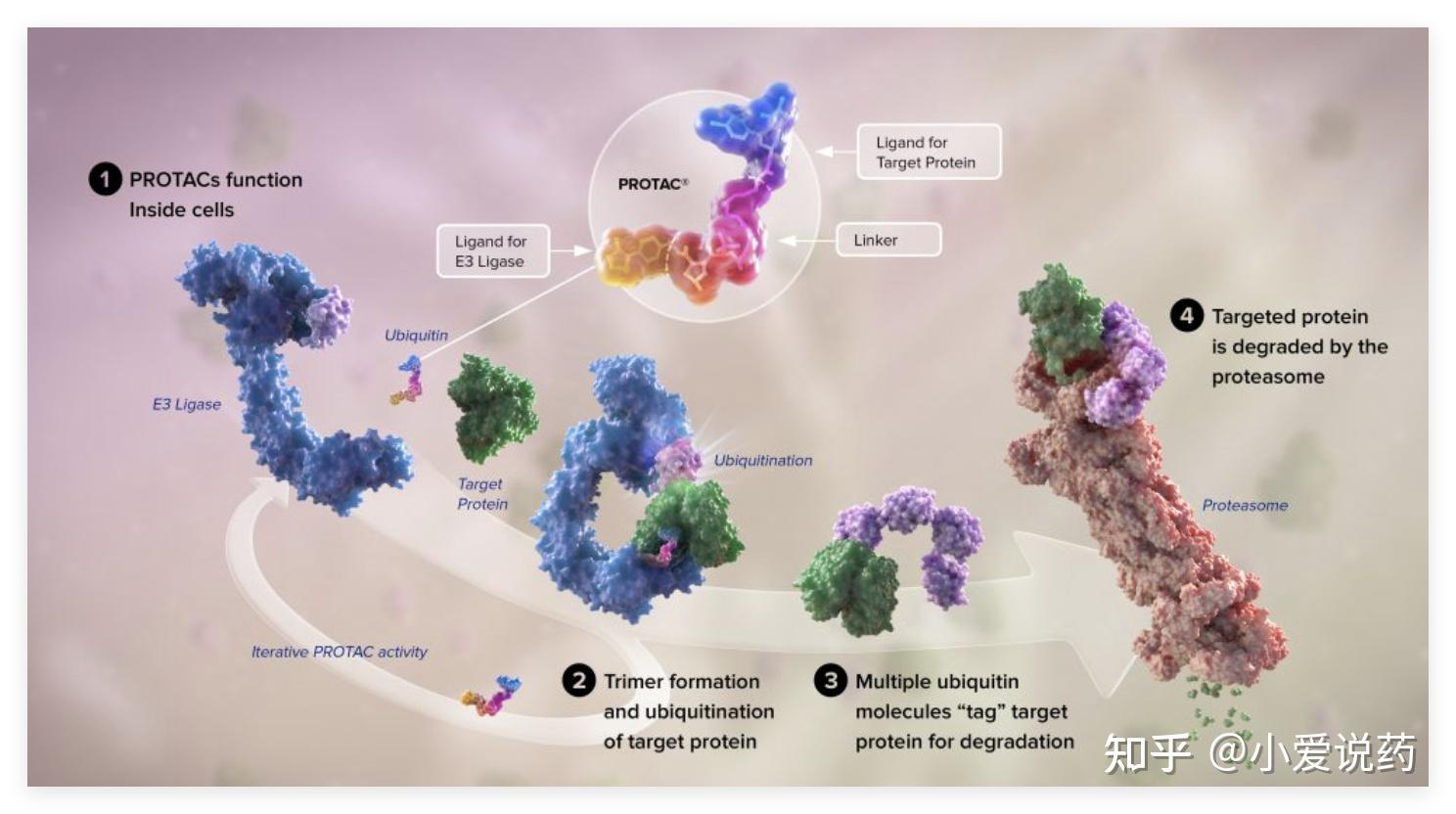 靶向蛋白降解技术(TPD)打破了这一天花板。它的原理很简单:不直接抑制蛋白功能,而是把「问题蛋白」标记为垃圾,让细胞的回收站——蛋白酶体——将其降解。这样,靶点有没有结合口袋都不重要,只要存在就能被清除。
