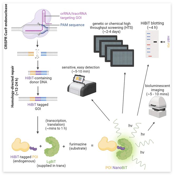 传统蛋白降解检测依赖外源过表达系统,存在表达量非生理性、标签干扰蛋白功能等局限。爱思益普采用CRISPR-Cas9基因编辑技术,将HiBiT标签(仅11个氨基酸)精准敲入内源性靶蛋白基因座,构建报告基因细胞系,实现对内源性蛋白降解的实时、定量监测。