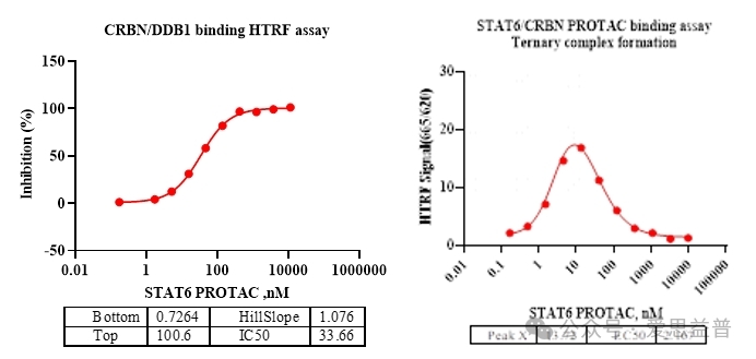 复合物形成实验能够全面表征蛋白与配体之间的相互作用,以及与E3连接酶形成三元复合物的能力。采用光谱位移法(SPS)与HTRF 技术,精准评估PROTAC 分子与 E3 连接酶(如 CRBN)的结合能力,及 “E3 连接酶 - PROTAC - 靶点” 三元复合物的组装效率 (如图5和图6)。通过SPR技术对化合物与 STATs 家族蛋白的结合动力学进行精准表征,为分子优化提供关键数据。