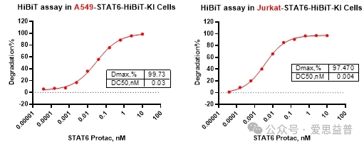 Western Blot是检测靶蛋白降解的金标准,而HiBiT则可支持化合物的高通量筛选测试。目前爱思益普的STAT6 HiBiT A549细胞系与Jurkat STAT6 HiBiT-KI细胞系均已构建完成,可用于化合物的筛选测试服务。(如图 7、图8)