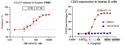 图10 IL-4诱导的人PBMC释放CCL17以及人B细胞激活marker CD23表达量的的检测