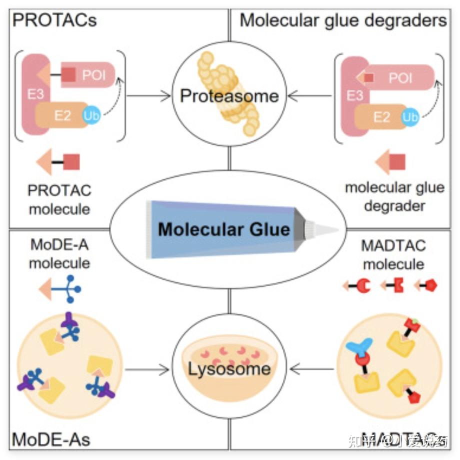 分子胶作为 TPD 领域的新兴技术,通过诱导蛋白质间相互作用(PPI)实现靶蛋白降解,为攻克「不可成药」靶点提供了新思路。与 PROTAC 的双头结构不同,分子胶是单个小分子(约 500 Da),像「胶水」一样把两个原本不结合的蛋白黏在一起,具有分子量小、口服生物利用度高、成药性好的优势,但设计难度大,需要精准调控蛋白相互作用。