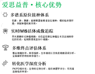 爱思益普体内药理团队拥有14年手术和影像学技术积累,打造了手术成功率高、死亡率低的核心技术平台。该平台的核心目的是,利用动物模型,在活体环境下模拟癌症的发生、发展和转移过程,从而精准地测试新药是否在真实世界患者中有效。该平台主要由两大模块构成,分别是原位癌和转移瘤,具有原位成瘤率高、转移灶检测灵敏、试验重复性高等特点。最值得关注的是,该平台结合本公司独立开发的众多耐药模型,可为一线到末线药物筛选提供全方位的、最大限度模拟真实世界的测试体系。